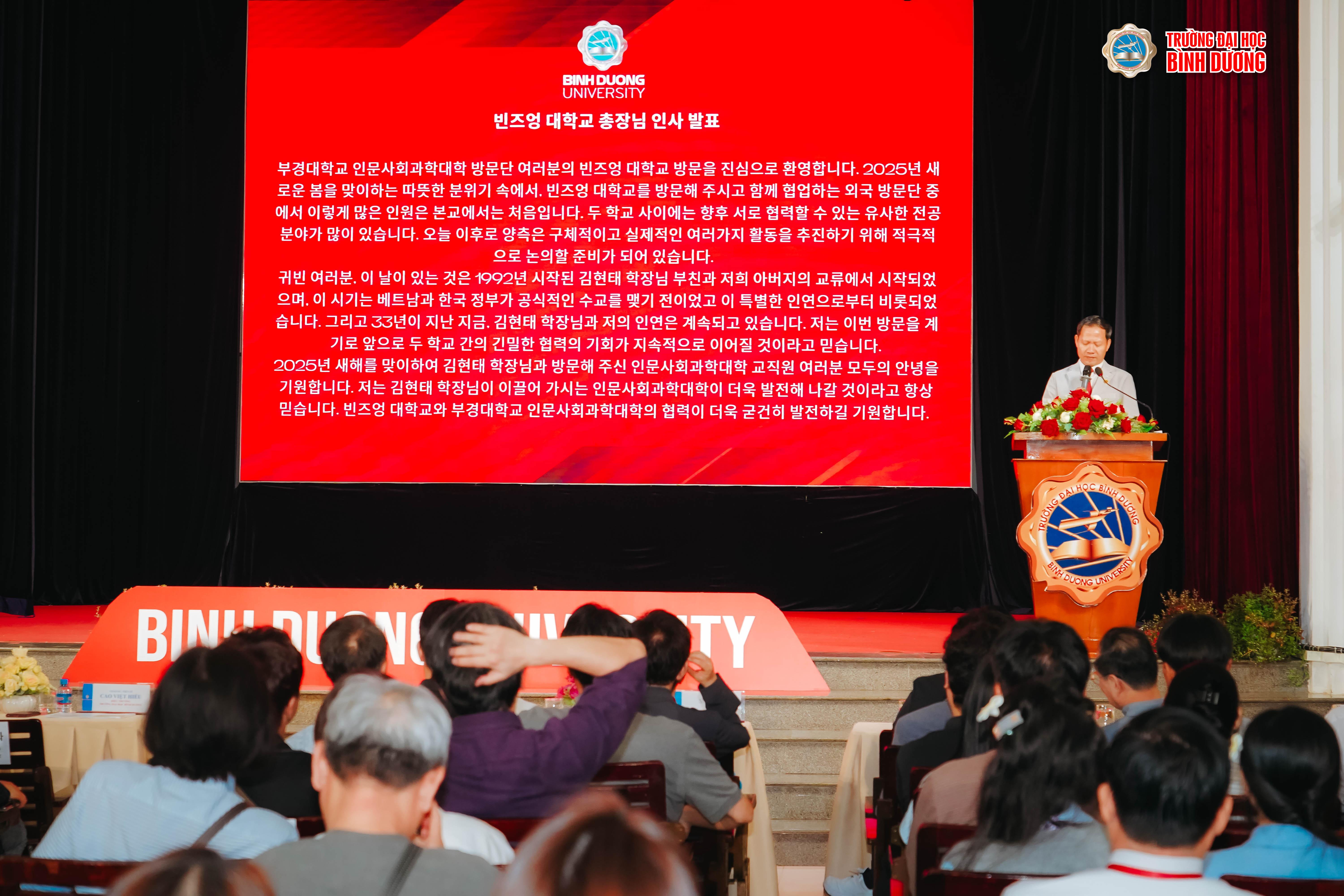 Ngày 20/1/2025, Đại học Quốc gia Pukyong (PKNU), Hàn Quốc, gồm GS.TS Kim Hyun Tae - Trưởng Khối Khoa học xã hội và Nhân văn Đại học quốc gia Pukyong; TS. Jeong Ho Yoon - Phó trưởng Khối Khoa học xã hội và Nhân văn; TS. Chae Young Hee - Giảng viên Khoa Ngôn ngữ và Văn học Hàn Quốc cùng các cố vấn và chuyên gia đã có chuyến thăm và làm việc với Trường Đại học Bình Dương (BDU).